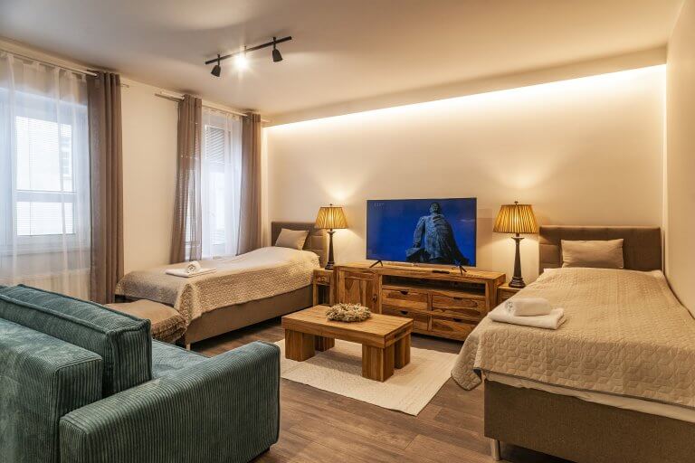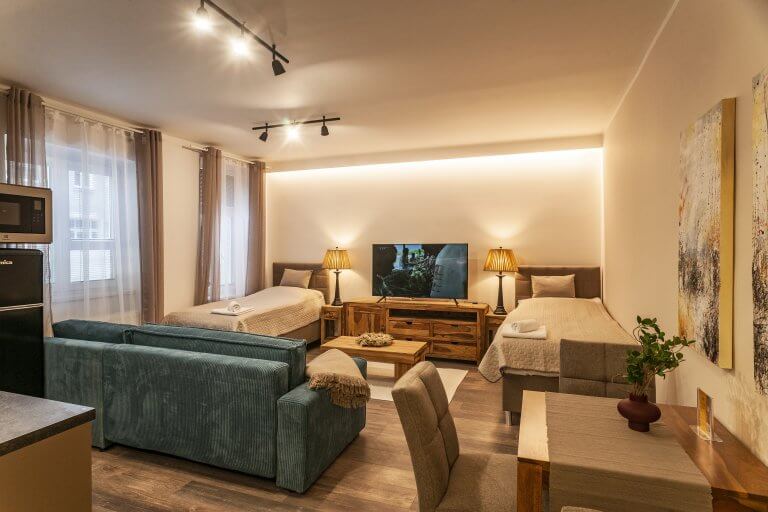 Each one of our apartments is designed in a distinctive style, is equipped with modern furniture and accessories, and has its own featured charm.